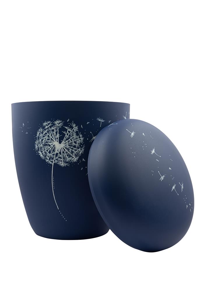 Urne aus biologisch abbaubarem Kunststoff mit hochwertigem Effektlack "atlantic-blue", moderne Form. Die Oberfläche hat durch den Effektlack eine matte Optik. Die Urne ist handbemalt mit dem Motiv "Pusteblume" in weiß. Inkl. Urnenversenkschnüre.