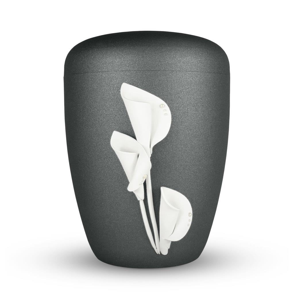 Urne aus biologisch abbaubarem Kunststoff mit hochwertigem Effektlack "iron", moderne Form. Die Oberfläche hat durch den Effektlack eine Sandstrahloptik und ist sehr robust. Haptik und Optik dieser Urne sind einzigartig. Die Urne ist mit einer handgefertigten Calla und Perlenapplikationen versehen. Die Calla erzeugt einen hochwertigen und edlen 3D-Effekt. Inkl. Urnenversenkschnüre.
