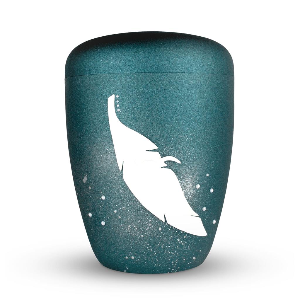 Urne aus biologisch abbaubarem Kunststoff mit hochwertigem Effektlack "türkis", moderne Form. Die Oberfläche hat durch den Effektlack eine Sandstrahloptik und ist sehr robust. Haptik und Optik dieser Urne sind einzigartig. Die Urne ist mit einer handgefertigten Feder und Perlenapplikationen versehen. Die Feder erzeugt einen hochwertigen und edlen 3D-Effekt. Inkl. Urnenversenkschnüre.