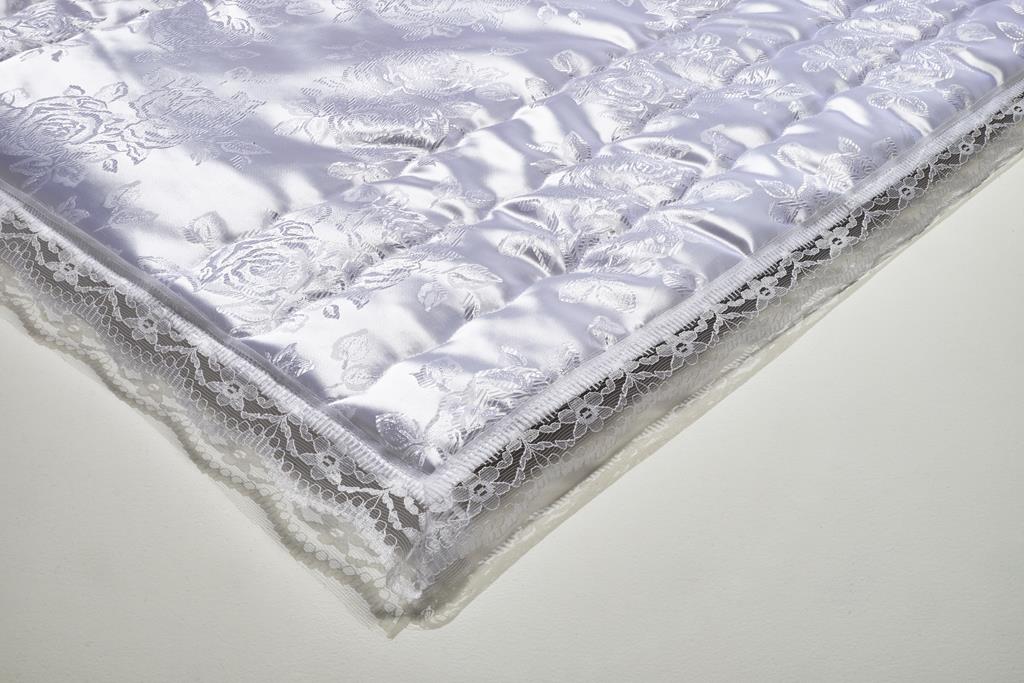 Deckengarnitur bestehend aus Decke und Kissen, Damast weiß, Rosenmuster (Dess. 7), Wellen-Endlossteppung, umrandet mit weißer Spitze, wattiert mit 120 g/m² Zellwolle (70% verrottbarer Viskose-Anteil), Rückenteil aus 60 g/m² PP-Vlies. Produziert in Deutschland! Maße Decke: 75 x 150 cm Maße Kissen: 55 x 65 cm Oberstoff: 100 % Viskose Wattierung: 120 g/m²