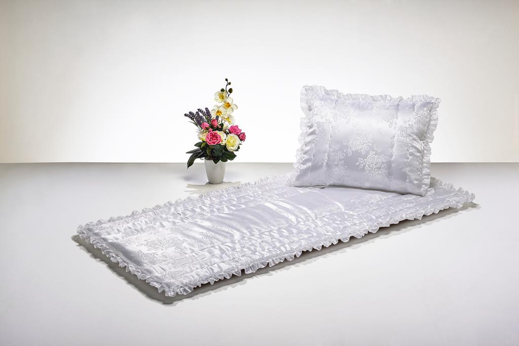 Deckengarnitur bestehend aus Decke und Kissen, Damast weiß, Rosenmuster (Dess. 7), Wellen- Endlossteppung, umrandet mit Volant, wattiert mit 120 g/m² Zellwolle (70% verrottbarer Viskose-Anteil), Rückenteil aus 60 g/m² PP-Vlies. Produziert in Deutschland! Maße Decke: 75 x 150 cm Maße Kissen: 55 x 65 cm Oberstoff: 100% Viskose Wattierung: 120 g/m²