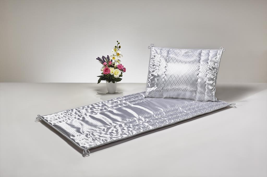 Deckengarnitur bestehend aus Decke und Kissen, Damast weiß, Gittermuster (Dess. 21), Wellen-Endlossteppung, umrandet mit weißer Kordel, wattiert mit 120 g/m² Zellwolle (70% verrottbarer Viskose-Anteil), Rückenteil aus 60 g/m² PP-Vlies. Produziert in Deutschland! Maße Decke: 75 x 150 cm Maße Kissen: 55 x 65 cm Oberstoff: 100 % Viskose oder Acetat Wattierung: 120 g/m²