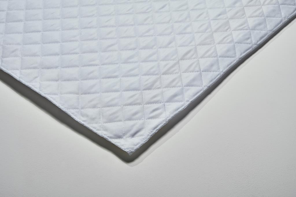 Deckengarnitur bestehend aus Decke und Kissen, Mischgewebe weiß, Rautenmuster, keine Umrandung, wattiert mit ca. 50 g/m² Polyester-Watte. Maße Decke: 80 x 160 cm Maße Kissen: 60 x 70 cm Oberstoff: Mischgewebe Wattierung: ca. 50 g/m²
