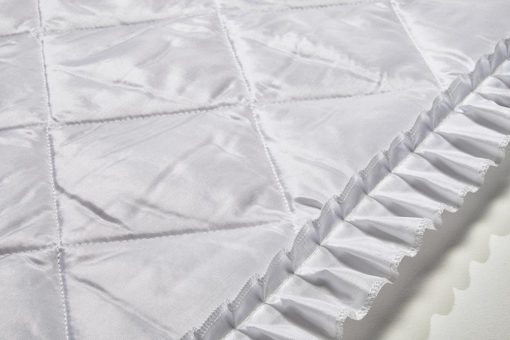 Deckengarnitur bestehend aus Decke und Kissen, Serge weiß, Karo-Endlossteppung, umrandet mit Volant, wattiert mit 120 g/m² Zellwolle (70% verrottbarer Viskose-Anteil), Rückenteil aus 60 g/m² PP-Vlies. Produziert in Deutschland! Maße Decke: 75 x 150 cm Maße Kissen: 55 x 65 cm Oberstoff: 100% Viskose Wattierung: 120 g/m² Besonderheiten: Karosteppung
