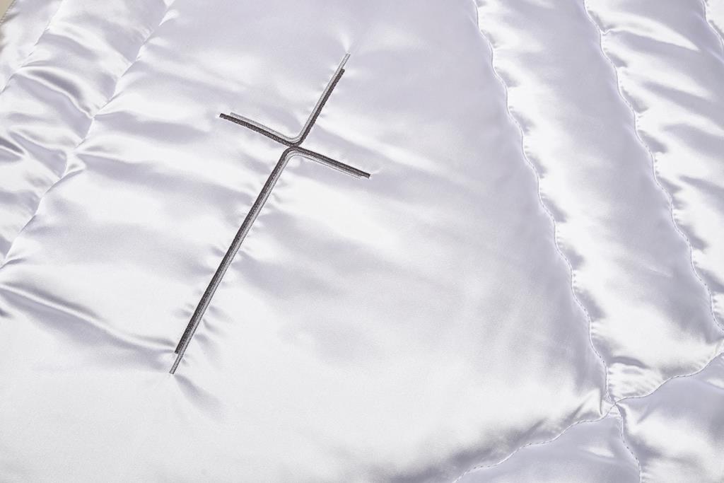 Deckengarnitur bestehend aus Decke und Kissen, Atlas weiß, gesticktes modernes Kreuz, umrandet mit Stehsaum, wattiert mit 250 g/m² Zellwolle (70% verrottbarer Viskose-Anteil), Rückenteil aus 80 g/m² PP-Vlies. Produziert in Deutschland! Maße Decke: 80 x 160 cm Maße Kissen: 60 x 70 cm Oberstoff: 100% Viskose oder Acetat Wattierung: 250 g/m² Besonderheiten: gestickte 'modernes Kreuz'