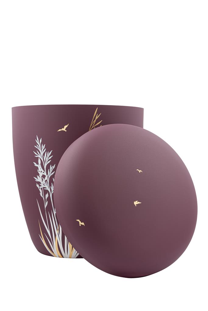 Urne aus biologisch abbaubarem Kunststoff mit hochwertigem Effektlack "beere-matt", moderne Form. Die Oberfläche hat durch den Effektlack eine matte Optik. Die Urne ist handbemalt mit dem Motiv "Gräser weiß + gold". Inkl. Urnenversenkschnüre. Produziert in Deutschland!