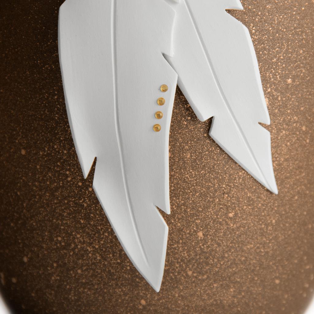 Urne aus biologisch abbaubarem Kunststoff mit hochwertigem Effektlack "bronze", moderne Form. Die Oberfläche hat durch den Effektlack eine Sandstrahloptik und ist sehr robust. Haptik und Optik dieser Urne sind einzigartig. Die Urne ist mit handgefertigten Federn versehen. Die Federn erzeugen einen hochwertigen und edlen 3D-Effekt. Inkl. Urnenversenkschnüre.