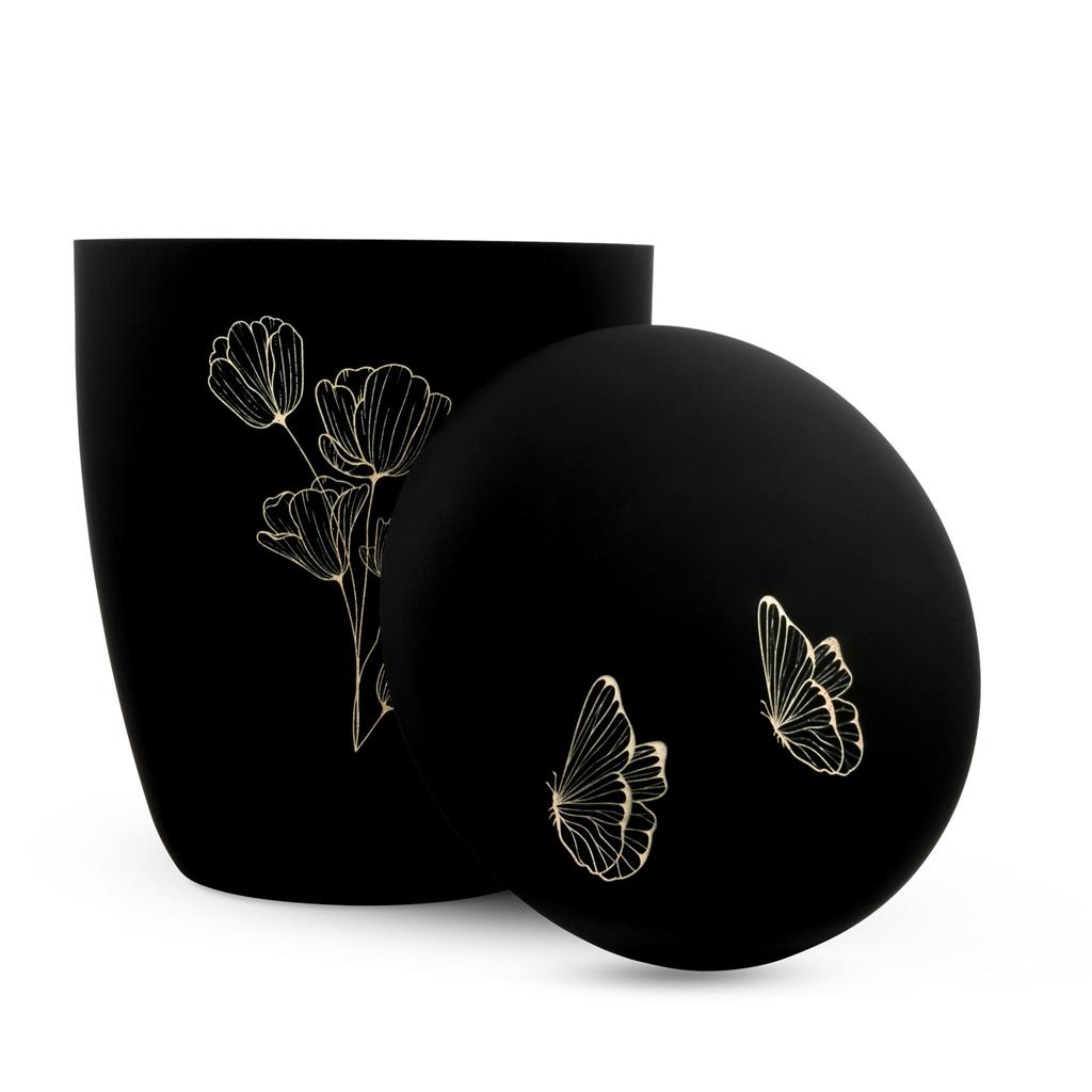 Urne aus biologisch abbaubarem Kunststoff mit hochwertigem Effektlack 'schwarz-matt', moderne Form. Die Oberfläche hat durch den Effektlack eine matte Optik. Die Urne ist mit einer hochwertigen Lasergravur "Blume mit Schmetterling" in weiß versehen. Inkl. Urnenversenkschnüre.